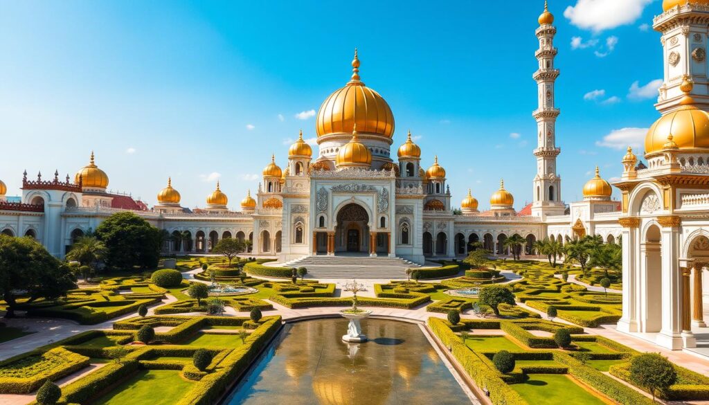 The Omar Ali Saifuddien Mosque stands tall in Bandar Seri Begawan. Its golden dome and intricate design are stunning. Built in 1958, it combines Malay and Islamic styles. It uses Italian marble, Chinese granite, and gold-plated domes.